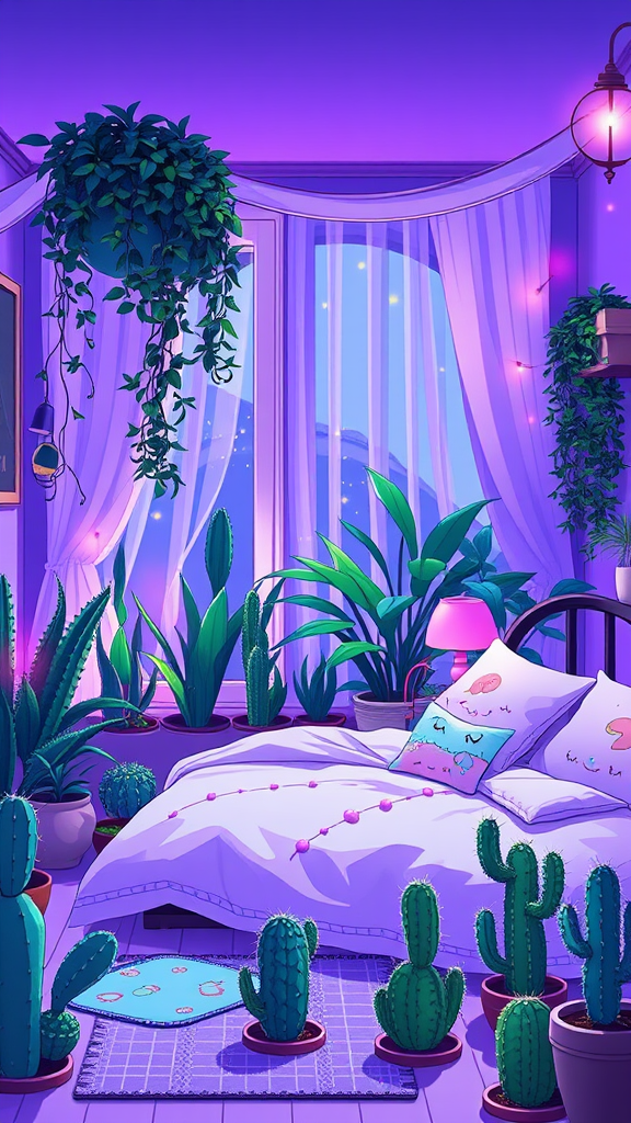 A cozy, anime-style bedroom bathed in soft purple light, featuring lush green plants and an array of cute cacti. The room exudes a serene nighttime ambiance, with twinkling fairy lights enhancing the dreamy atmosphere. A comfortable bed with whimsical bedding and charming decor pieces add a touch of playful elegance, making it a perfect retreat for relaxation and imagination.