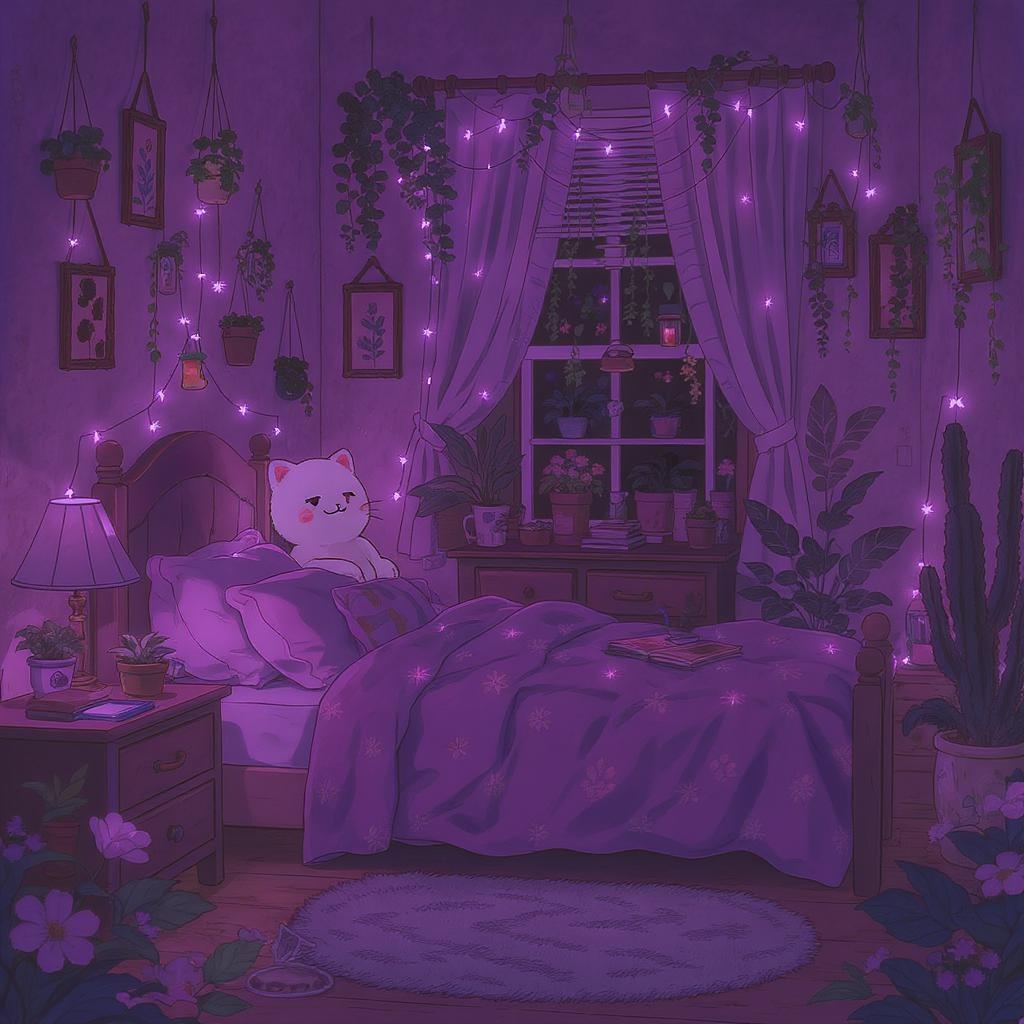 A cozy anime-style bedroom softly illuminated by gentle purple lights, filled with lush plants and cute cacti that create a serene night-time oasis. The room radiates charm and tranquility, with whimsical decor and a dreamy ambiance that invites relaxation and imagination.