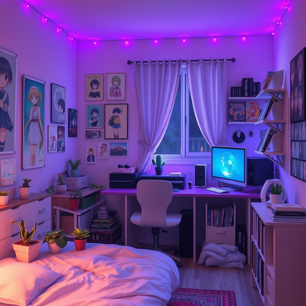 A cozy bedroom adorned with an anime-inspired aesthetic, enveloped in the gentle glow of soft purple lights. The room is filled with charming details: small potted plants adding a touch of life, while a singular cactus stands proudly on the windowsill. The space exudes a sense of warmth and creativity, with hints of a gamer otaku lifestyle scattered throughout. Posters of favorite anime characters line the walls, alongside shelves brimming with manga and collectibles. A glowing computer setup hints at late-night gaming sessions, capturing the essence of a visual novel background. The overall ambiance is inviting and serene, a perfect blend of cute and cozy.