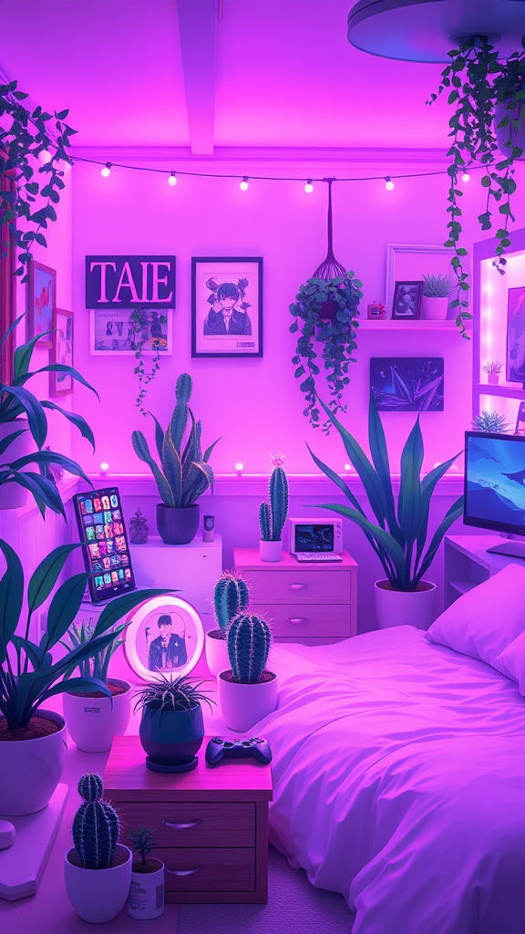 A cozy bedroom adorned with an anime-inspired aesthetic, illuminated by soft purple lights casting a gentle glow across the room. Lush, vibrant plants and adorable cactus arrangements add a touch of nature and whimsy to the scene. Gaming and otaku elements are subtly integrated, with sleek gadgets and treasured collectibles scattered around. This charming sanctuary feels like a visual novel background, where every detail contributes to its harmonious blend of cuteness and sophistication.