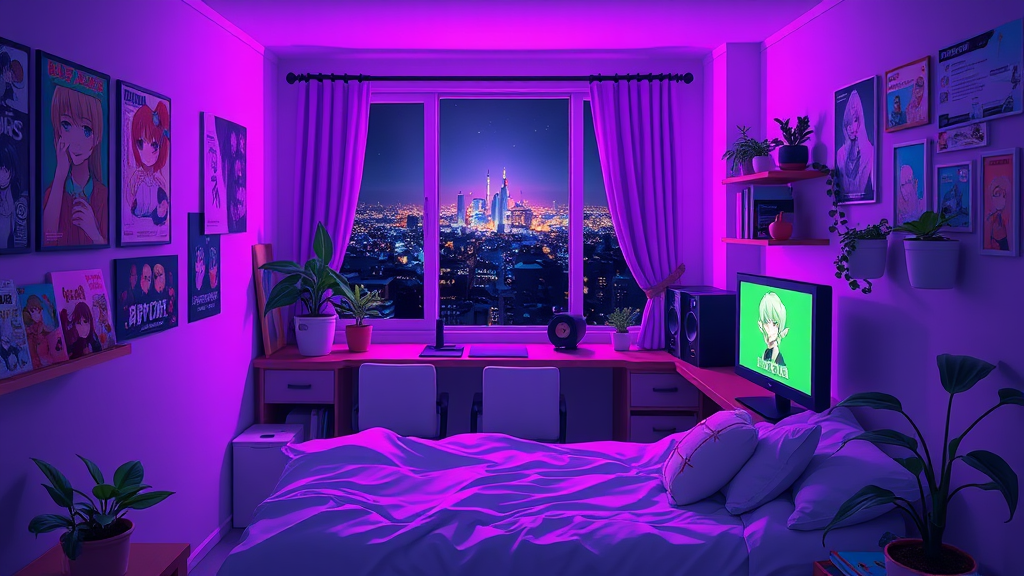 A cozy bedroom bathed in a soft purple glow, capturing the essence of a gamer otaku's haven. The room features anime posters on the walls, with shelves filled with manga and collectibles. A comfortable bed is adorned with cute plushies, and a single cactus sits on the windowsill, surrounded by a few other lush plants that add a touch of nature to the space. A computer setup displaying a visual novel invites an engaging gaming session. The ambiance is calming, accentuated by the serene night outside, creating a perfect blend of aesthetic charm and anime style.