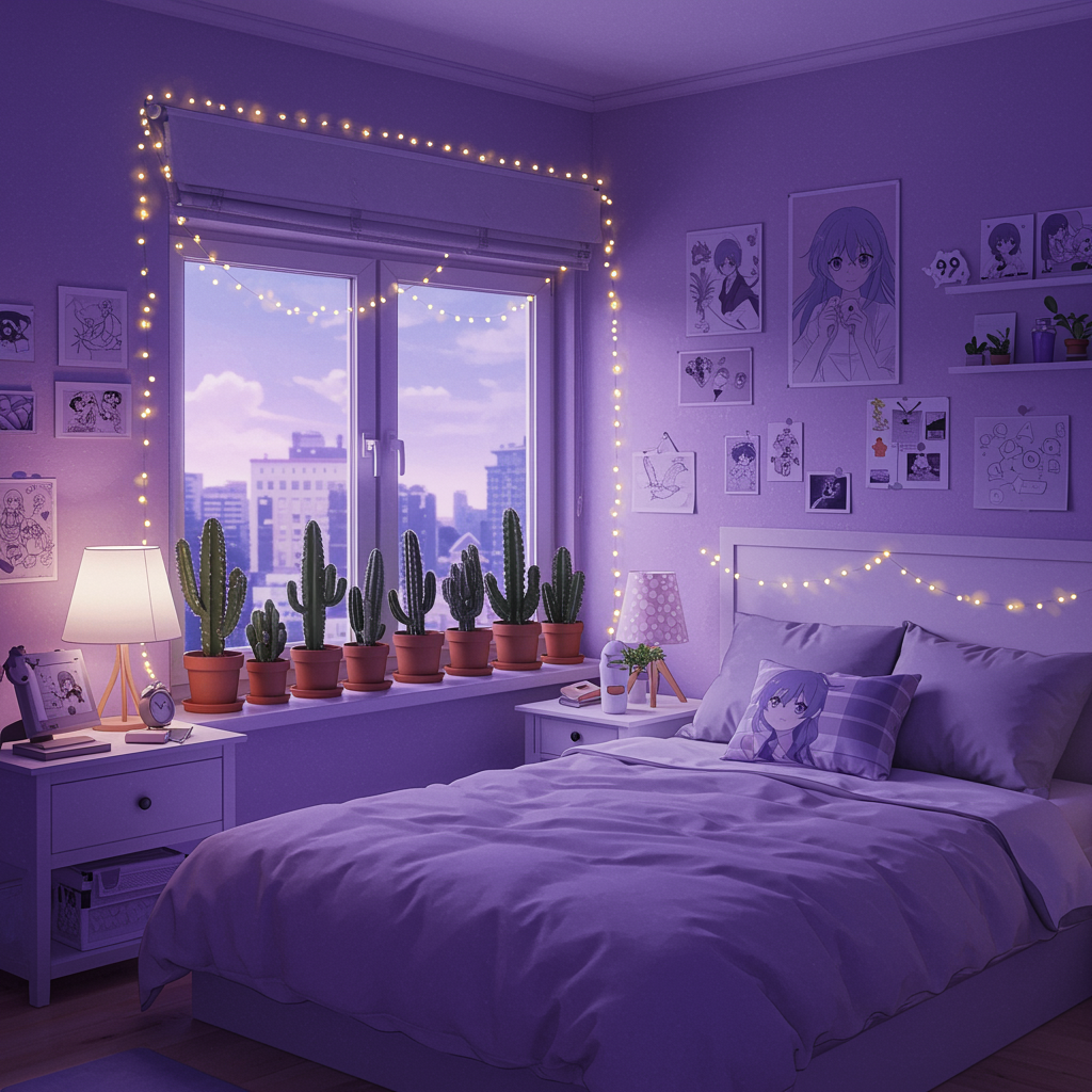A cozy bedroom bathed in gentle purple hues, filled with anime-inspired decor, where adorable cactus plants line the windowsill and soft, ambient lights create a dreamy, night-time atmosphere.