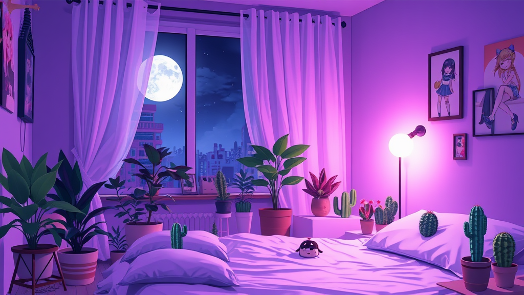 A cozy bedroom bathed in soft purple lights, exuding an anime charm, features an array of cute potted plants and whimsical cacti. The night scene is serene, with moonlight filtering through delicate curtains, casting gentle shadows. Walls adorned with playful anime prints add a touch of fantasy, completing this enchanting sanctuary.