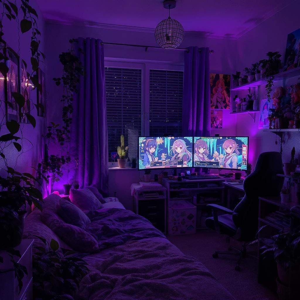 A cozy bedroom with an anime-inspired aesthetic sits under the gentle embrace of night, bathed in the soft glow of purple lights that create a serene and dreamy atmosphere. Lush greenery frames the room with a variety of plants, their leaves casting delicate shadows, while a solitary cactus stands proudly on the windowsill. The space emanates a cute and playful charm, reflecting the personality of a gamer otaku. Shelves lined with gaming memorabilia and anime figurines add character, and the walls are adorned with vibrant posters of beloved anime series. A large monitor displays a captivating visual novel, inviting adventures from the comfort of a plush chair. This enchanting oasis blurs the line between reality and imagination, creating a perfect backdrop for nights filled with gaming and anime escapades.