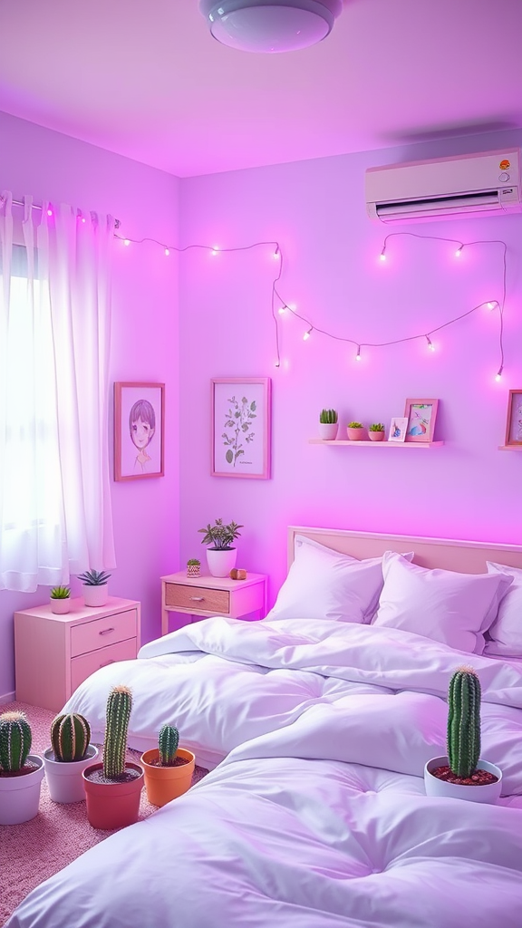 A cozy bedroom with an anime-inspired touch, softly illuminated by gentle purple lights creating a dreamy night-time ambiance. The space is brimming with charming details like cute cactus plants subtly arranged around the room, giving it a fresh and vibrant feel. Accents of pastel colors blend seamlessly, enhancing the room’s cute and whimsical aesthetic.