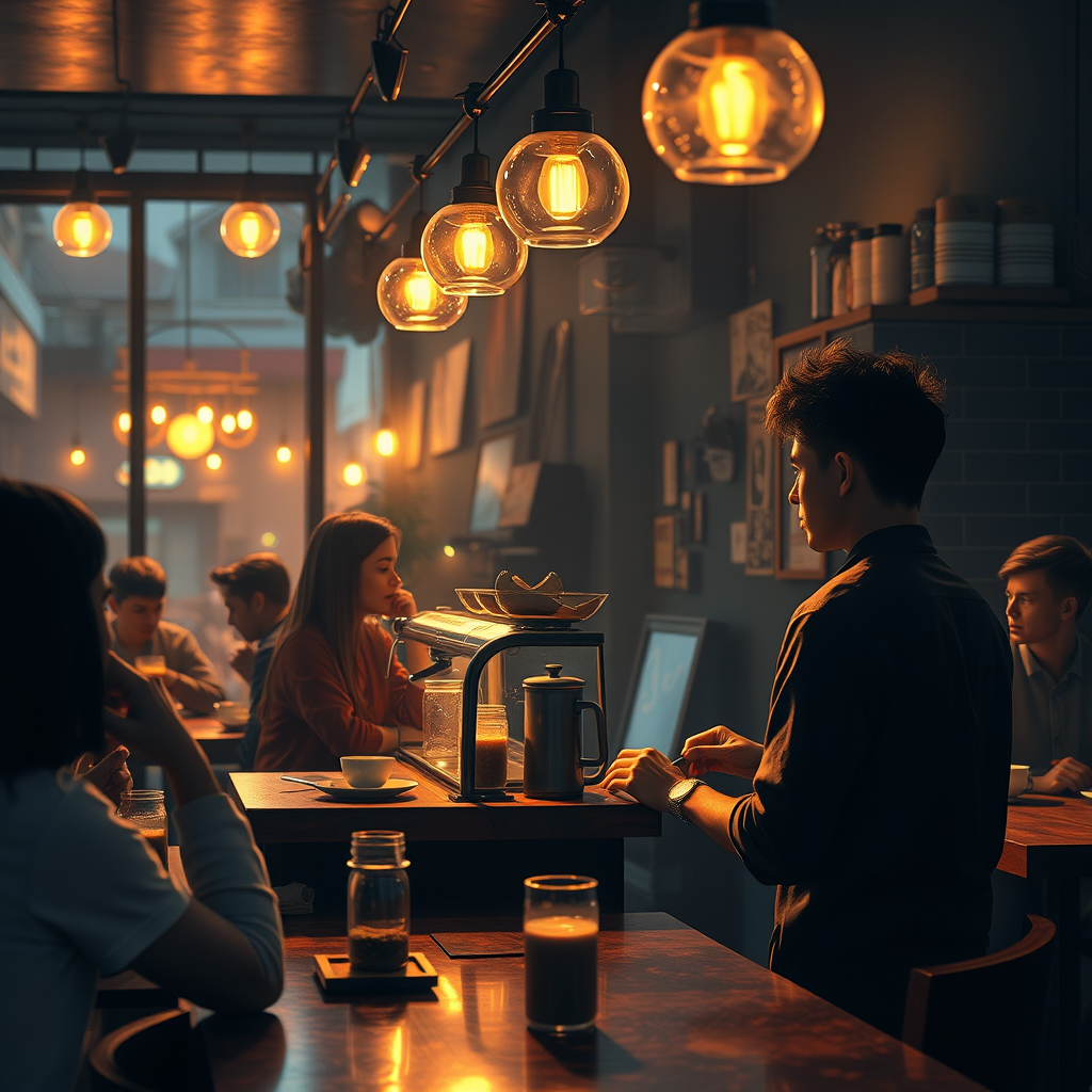 A cozy café in the evening bustling with young people enjoying coffee, enhanced by cinematic illumination. A skilled barista expertly crafts drinks at the counter. Digital art captures the scene with glow effects, hand-drawn textures, and a beautiful blend of octane render and cinema 4D techniques. The atmosphere is dark yet warm, inviting with its detailed, ultra-high-definition quality. Rich colors shine through a vivid and masterful oil painting style reminiscent of Ed Blinkey, Atey Ghailan, Studio Ghibli, Jeremy Mann, and Greg Manchess. The setting is atmospheric, photorealistic, and filled with intricate detail, a masterpiece capturing the lively and humorous interactions of patrons. This concept art is trending on ArtStation and CGSociety, rendering the scene with a professional touch.