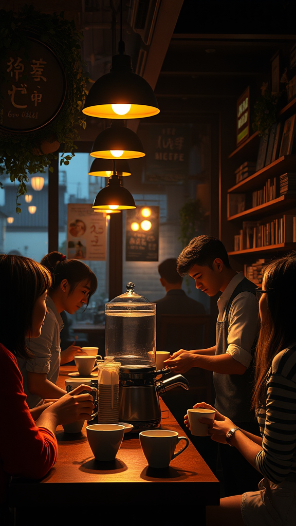 A cozy café in the evening buzzes with youthful energy as young people savor the aroma of freshly brewed coffee. Cinematic lighting casts a warm glow over the scene, highlighting the skilled barista at the counter who meticulously crafts each cup. The atmosphere is dark and atmospheric, with intricate details captured in ultra-high-definition. The setting resembles a masterpiece painting with vivid colors and a model shoot style, reminiscent of the works of Ed Blinkey, Atey Ghailan, and Studio Ghibli. The artwork is hyperrealistic with a sharp focus, showcasing a humorous yet majestic illustration. This concept art, trending on ArtStation and CGSociety, exudes dramatic photorealism akin to the styles of Jeremy Mann, Greg Manchess, Antonio Moro, and Greg Rutkowski, creating a vivid, immersive scene.