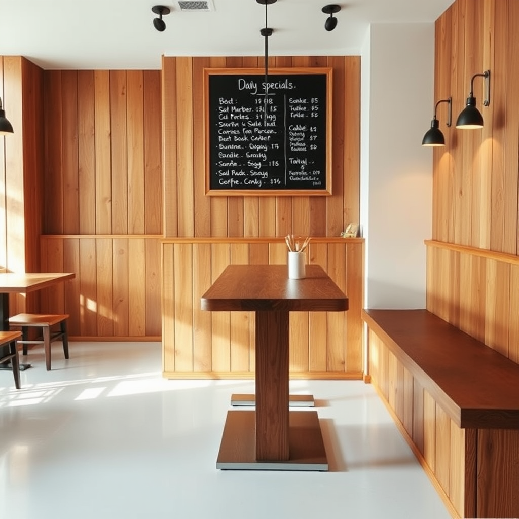 A cozy cafe features a sleek bar table with a polished wood finish, surrounded by rustic wooden walls that exude warmth. The floor is a pristine white, enhancing the airy feel of the space. Soft, inviting lighting casts a gentle glow, creating a welcoming atmosphere. The minimalist interior is thoughtfully designed with subtle accents, maintaining a clean and uncluttered look. Above, a classic blackboard adds a charming touch, displaying the daily specials in handwritten script.