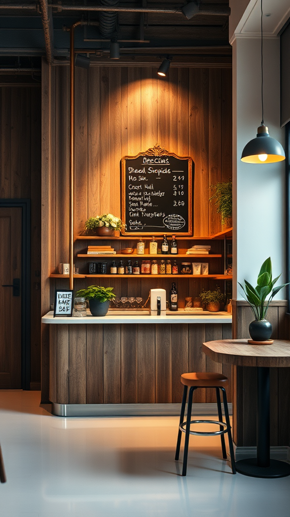 A cozy cafe with a sleek bar counter, surrounded by rustic wooden panels and a pristine white floor. Soft, amber lighting bathes the space, creating a tranquil ambiance. The interior is minimalist, with clean lines and uncluttered surfaces. Above the bar, a vintage-style blackboard scribbled with daily specials adds a touch of charm. A few green plants are strategically placed to infuse a hint of nature into the scene.