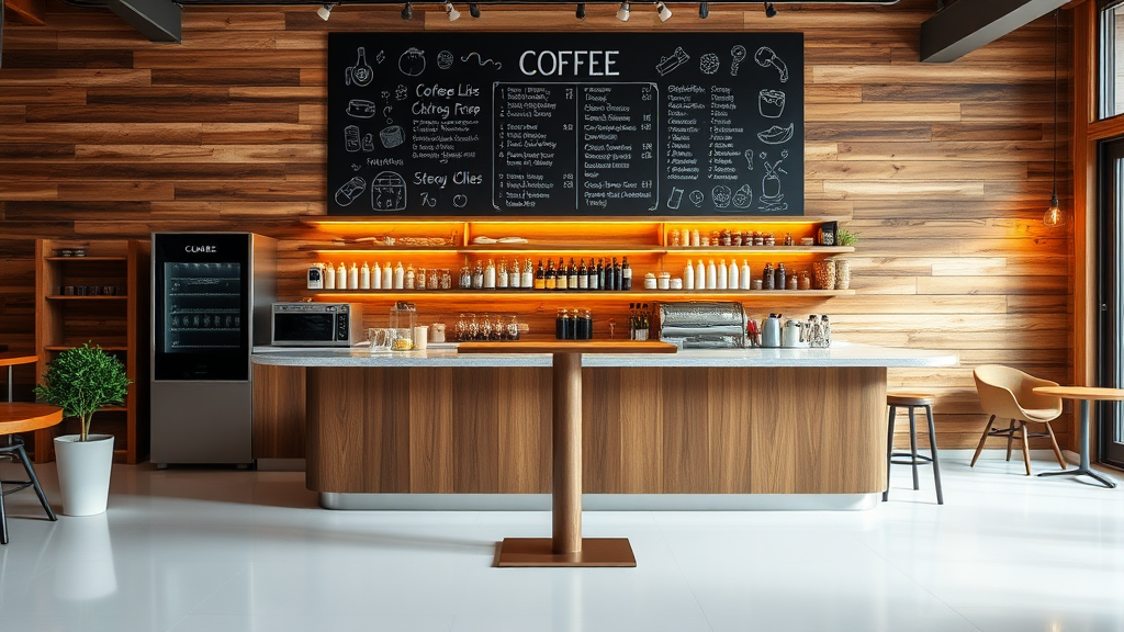 A cozy coffee shop with a sleek bar table, surrounded by rustic wooden walls and a polished white floor. The warm, ambient lighting casts a gentle glow, enhancing the minimalist interior design. Above the bar, a large blackboard displays the day's specials and quaint doodles, adding a touch of charm to the modern atmosphere.