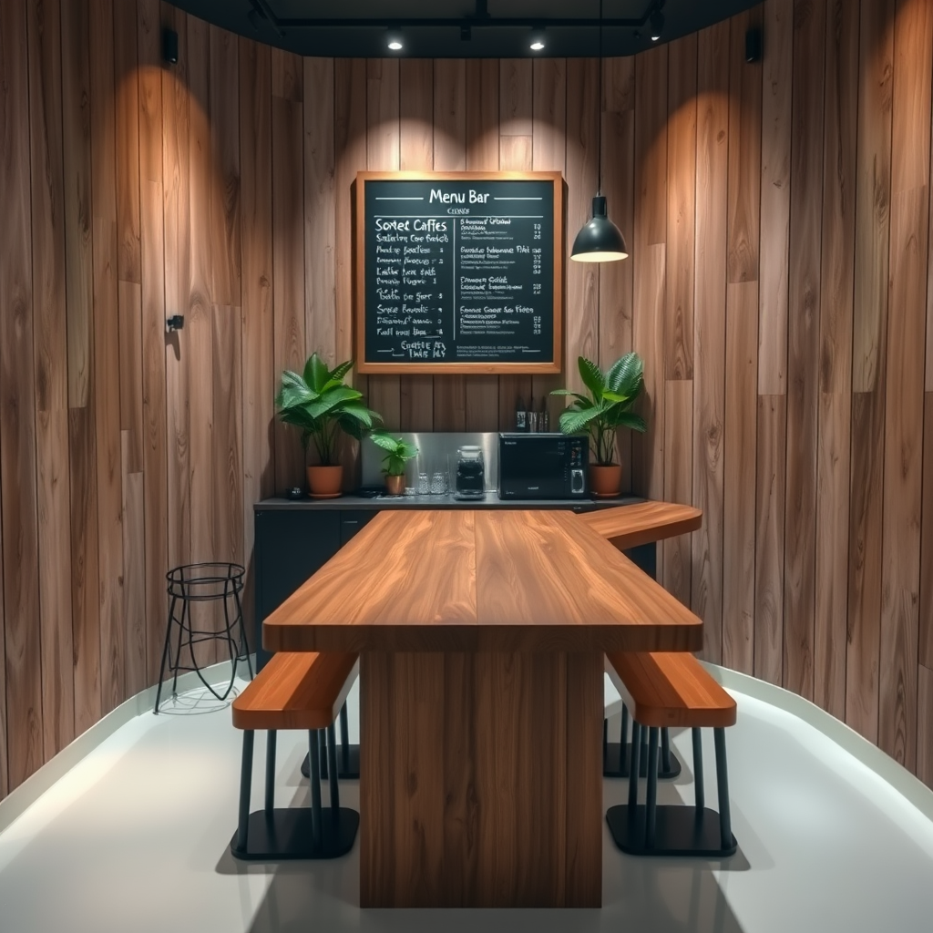 A cozy corner coffee shop featuring a sleek bar table with a polished wooden surface, surrounded by rustic wooden panel walls. The floor is a pristine white, complemented by warm, inviting lighting that casts a gentle glow throughout the minimalist interior. A chalkboard menu is thoughtfully placed above the bar, adding a charming touch to the modern, uncluttered decor. Few green plants are strategically placed to bring a touch of nature inside.