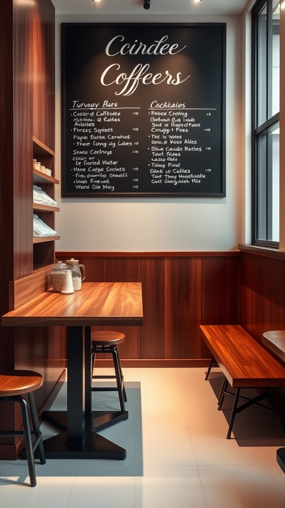 A cozy corner in a coffee shop features a sleek bar table with polished wood tones, surrounded by rich mahogany walls. The floor beneath is a pristine white, enhancing the warm, ambient glow of the softly lit space. The minimalist interior design is accentuated by a large blackboard overhead, displaying the day’s specials in elegant chalk calligraphy.