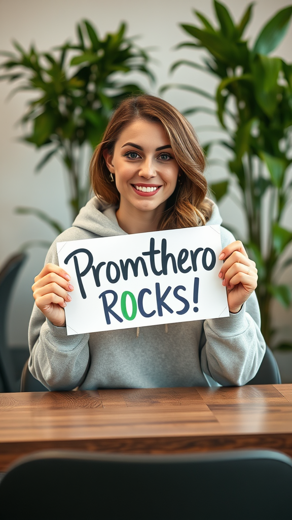 A cozy Instagram photo captures a woman seated at a stylish wooden table, clad in a soft, pastel grey hoodie. In her hands, she proudly displays a colorful sign adorned with the playful handwriting "Promthero Rocks!" Her warm smile meets the camera's gaze, exuding enthusiasm. Behind her, the blurred backdrop features two lush office plants, framing her in a relaxed, modern workspace.