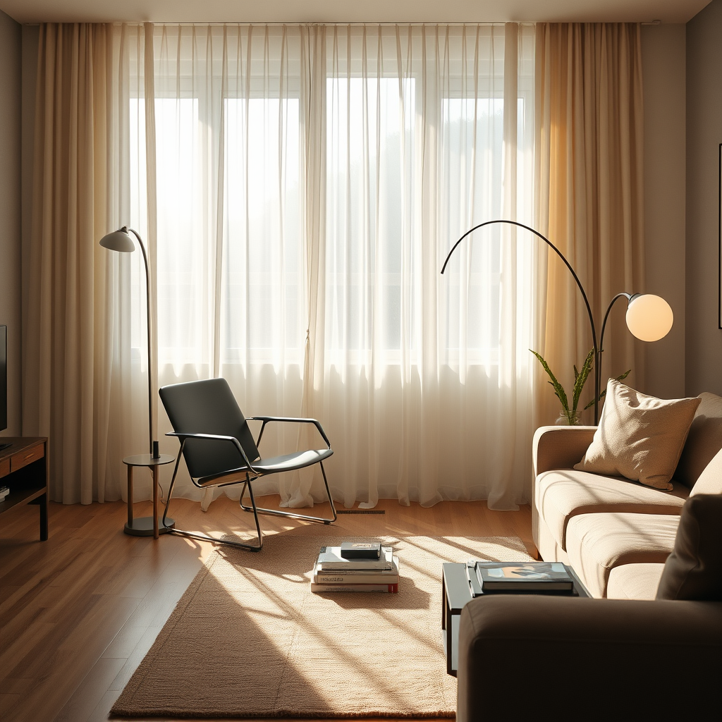 A cozy, mid-sized living room bathed in the soft glow of morning light filtering through delicate sheer curtains, showcasing a harmonious blend of modern and minimalist elements. At a gentle angle, the focus is drawn to a Dieter Rams 620 chair program, its sleek design inviting relaxation. Nearby, a Flos Arco floor lamp gracefully arches, casting a warm, inviting light over the scene. Captured with a Nikon Z6 II and a 35mm f/1.8 lens, the room is alive with subtle shadows and highlights, the morning serenity captured in each detail. There’s a sense of calm elegance, underscored by tasteful decor, including a simple, yet stylish rug and a few carefully selected books on a low-profile coffee table.