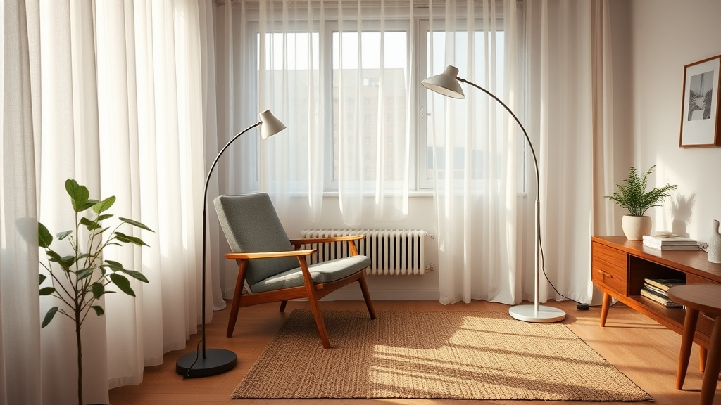 A cozy mid-sized living room captured from a candid angle, featuring a Dieter Rams 620 chair program paired with a sleek Flos Arco floor lamp. Soft morning light filters through the sheer curtains, casting a gentle glow across the room. The photograph is taken with a Nikon Z6 II and a 35mm f/1.8 lens, enhancing the serene ambiance. A subtle herb plant in the corner adds a touch of greenery, while a woven rug on the wooden floor brings warmth and texture.