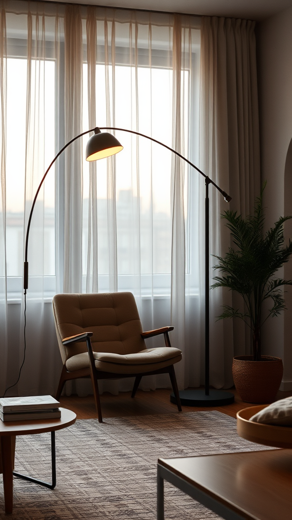 A cozy mid-sized living room captured from a natural angle features a Dieter Rams 620 chair program elegantly positioned under the gentle arc of a Flos Arco floor lamp. The scene is photographed with a Nikon Z6 II and a 35mm f/1.8 lens, showcasing the intricate textures and details. Soft dusk light filters through sheer curtains, casting a warm, ambient glow across the room. The setting is completed by a minimalist coffee table with a few art books and a tall potted plant in the corner, adding a touch of nature to the space.