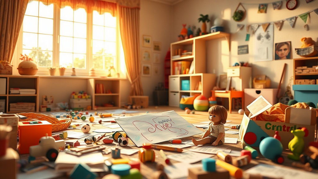 A cozy playroom brimming with toys and scattered papers, capturing a child's limitless creativity. A delightful drawing rests amid the chaos as warm, golden sunlight streams through a large window, illuminating the scene. The focus is razor-sharp, enhanced in 8k ultra high definition with the precision of a DSLR capturing photorealistic detail. Hyperrealism saturates the room with vivid color, enhanced by expert post-processing and vibrant color grading. The masterful composition is intricately detailed, using physics-based rendering and raytracing for an unparalleled RAW photo, achieving a masterpiece of the highest quality. Shadows and illustrations are rendered with utmost care, perfectly blending CGI elements in 3D. Amidst the lively scene, a charming doll bears witness to the imaginative spirit, although ensuring the scene stays clear of low quality, distorted visuals, or poorly rendered details that detract from the vibrant harmony within the room.