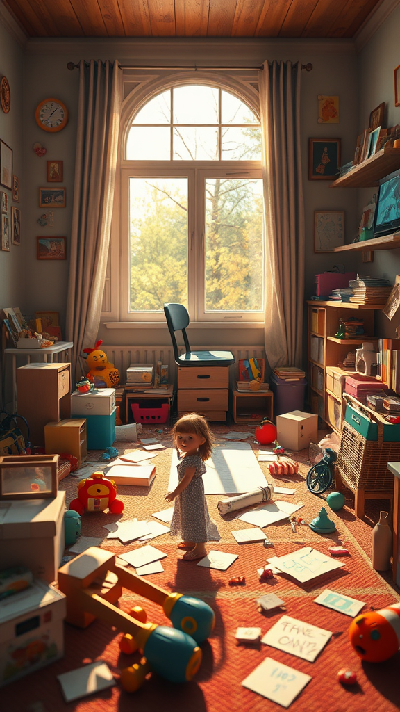 A cozy room brimming with toys and scattered papers, embodying a child's boundless imagination. The room is illuminated by warm golden sunlight streaming through a generous window, highlighting a child's drawing. The scene is in sharp focus with 8k UHD detail, showcasing photorealistic hyperrealism with vivid colors. The image undergoes sophisticated post-processing and vibrant color grading, resulting in a highly intricate and hyperrealistic ambiance. Utilizing raytracing and physics-based rendering, this RAW masterpiece is of the highest quality, with exceptional shadow detailing and illustration-like CGI. The room features a doll, maintaining artistic integrity free from errors such as low resolution, text issues, or poor quality jpeg artifacts. Perfectly proportioned with no duplicates or distortions, every element is in frame with accurate anatomy and composition.