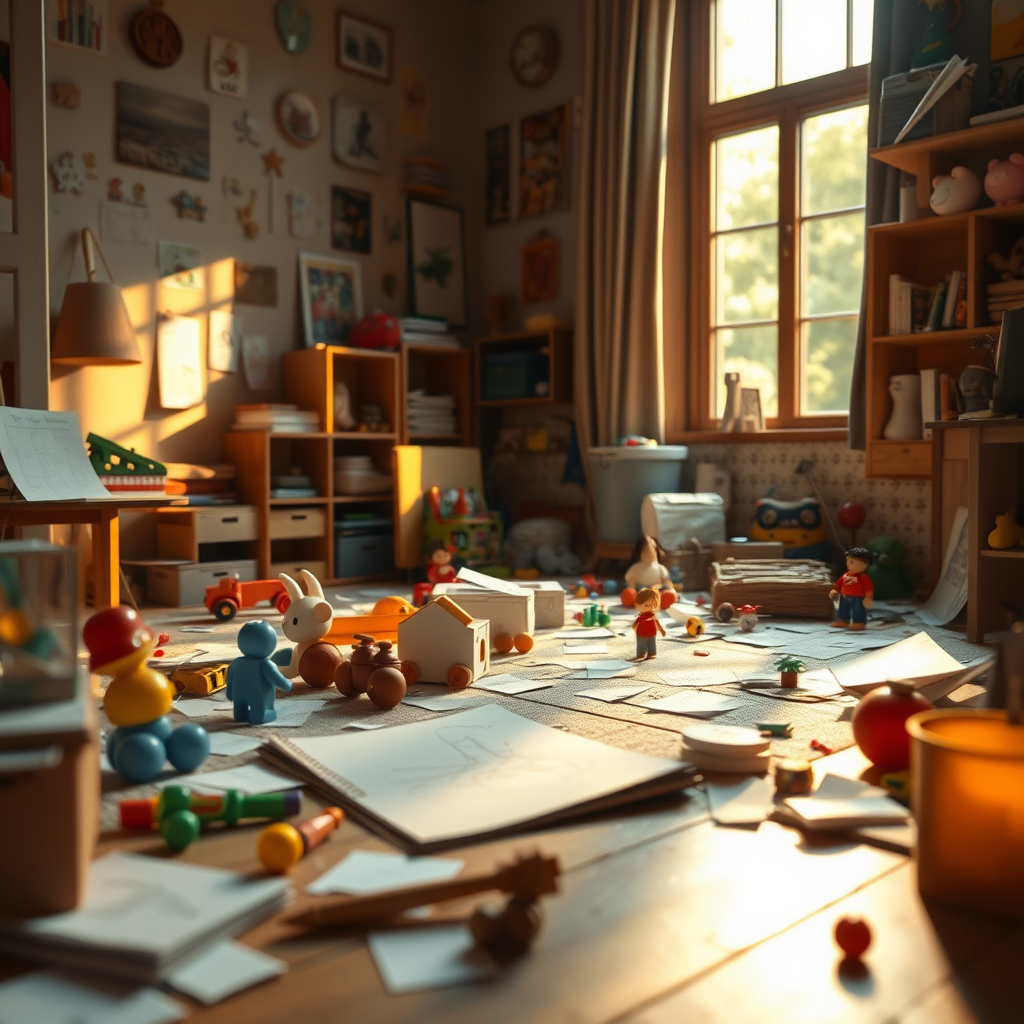 A cozy room filled with toys and scattered papers, capturing a child's boundless imagination. A child's drawing rests nearby as warm golden sunlight seeps through a large window, illuminating the space. The scene is in sharp focus with 8k ultra-high definition quality, resembling a DSLR photorealistic masterpiece. Hyperrealism is achieved with intricate details and vivid colors, enhanced through expert post-processing and vibrant color grading. The complex composition uses raytracing and physics-based rendering to create a highly realistic atmosphere. Despite the high definition, the room portrays a lively and imaginative chaos commonly found in a child's play area, preserving an authentic and endearing charm.