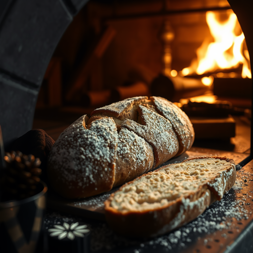 A cozy scene featuring traditional Christmas stollen bread bathed in the warm glow of a wood-burning oven, set against a black and gold color palette. The intricate details of the stollen, with its powdered sugar and rich textures, stand out vividly. The photorealistic lighting casts deep, inviting shadows, enhancing the rustic charm of the setting. Captured with a wide angle to include hints of A+D architectural elements, the image embodies kinfolk photography's essence, blending nuanced realism with a sophisticated, warm ambiance.