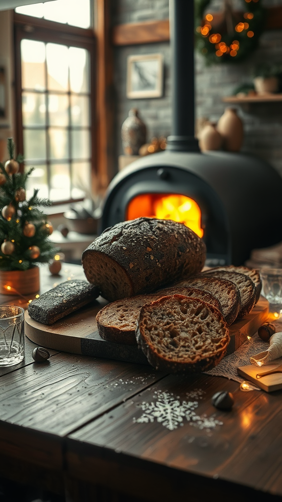A cozy still life scene featuring traditional Christmas stollen bread arranged on a rustic wooden table, illuminated by the warm glow of a nearby wood-burning oven. The palette features rich black and shimmering gold accents, creating a sophisticated ambiance. The intricate detail captures the essence of photorealism, with realistic light casting delicate shadows and highlighting textures, set in a spacious room reminiscent of A+D architecture. The wide-angle perspective invites viewers into this tranquil setting, evoking a sense of warmth and festivity typical of kinfolk photography.
