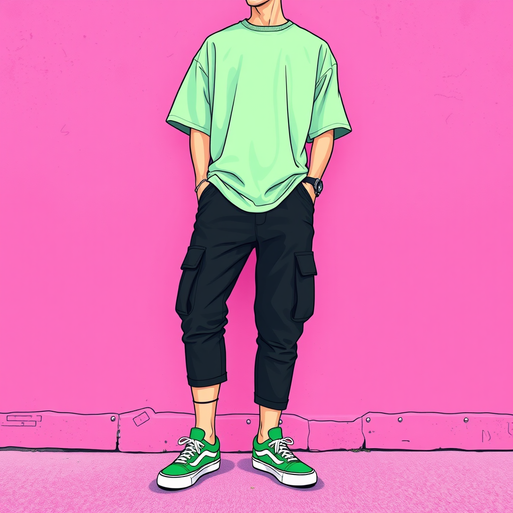 A creative illustration art features a full-body depiction of a man with a mint green oversized T-shirt and black capri cargo pants, complemented by green Vans old-school sneakers. The scene blends into a vividly colored digital artwork with bold outlines and a palette of bright pink, neon green, and magenta. The artwork adopts a playful, cute cartoonish style, showing the man posed against a vibrant, vivid wall that fills the solid background. The image maintains a youthful, energetic vibe, capturing the essence of color and style.