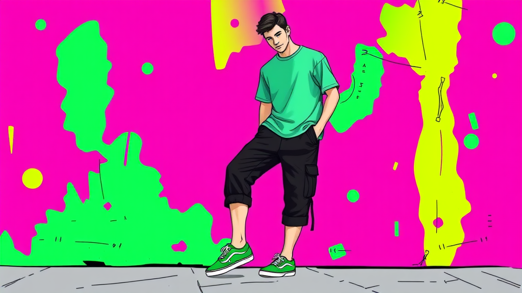 A creative illustration art of a full-body male figure wearing a loose-fitting mint green T-shirt and black capri cargo pants paired with vibrant green Vans old school sneakers. The man seamlessly integrates into a vividly colored digital artwork characterized by bold outlines and bright shades of pink, neon green, and magenta. The artwork's style is playful and cartoonish, with the man posed against an energetically colorful wall that dominates the background, featuring lively patterns and whimsical details maintaining the whimsical essence.