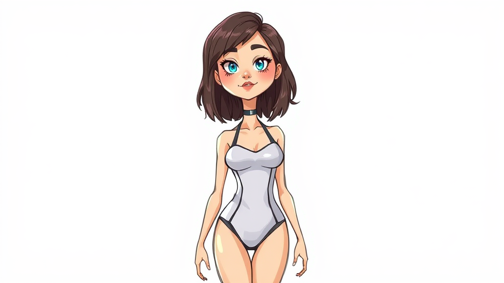 A creative sketch illustration featuring a woman in a leotard stands against a minimalist white background. The art style is reminiscent of AshleyCipher, with a touch of Evalyn_noexist's unique influence. The scene blends elements of 3D rendering and cartoon animation, bringing a playful, childish charm to the figure. The woman's expression is highlighted with vibrant makeup, and her form playfully explores the concept of duplication and mild deformation. Rendered with care, subtle intricacies in the design suggest missing yet implied features, such as limbs, adding to the whimsical appeal of the piece.