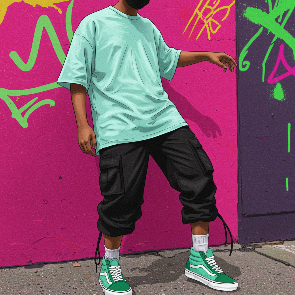 A creatively illustrated artwork of a full-body man dressed in a pastel mint green oversized T-shirt paired with black capri cargo pants, and vibrant green Vans old-school sneakers. The scene blends into a vividly colored digital canvas featuring bold outlines and an explosion of bright pink, neon green, and magenta hues. The man's positioning is playful and interactive with the vibrant wall that serves as a dynamic backdrop. The art includes a whimsical, cartoonish style with a touch of humor and fun, adding an element of light-heartedness and youthful energy to the composition while maintaining the core theme.