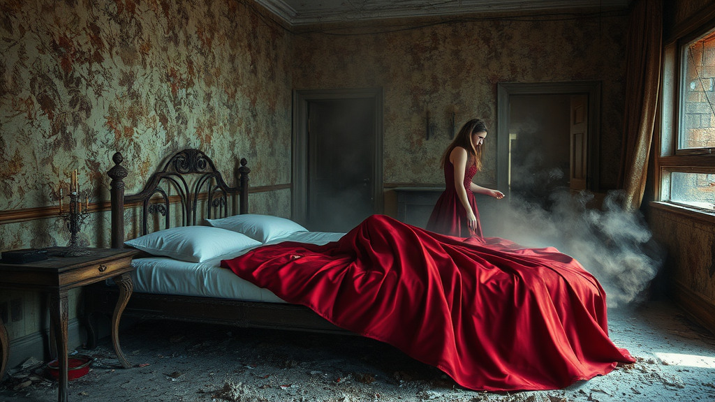 A crimson gown elegantly abandoned atop a weathered bed in a post-apocalyptic chamber, dust swirling through a room ravaged by time, tattered corners and peeling wallpaper. An ethereal scene captured in hyper-realistic detail, with the haunting presence of a woman nearby, her silhouette blending into the faded, surreal backdrop, reminiscent of a forgotten world captured in ultra-high definition.