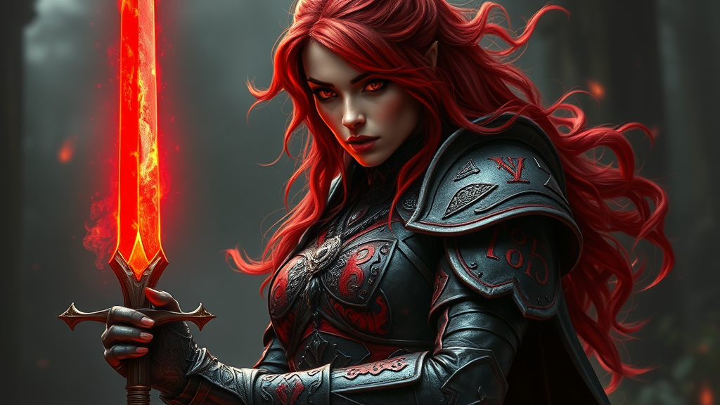 A crimson-haired enchantress stands before me, her fiery tresses and blazing eyes cutting through the gloom. She is clad in foreboding black-red armor, adorned with sinister crimson runes, each mark a testament to the dark arts. In her grip is a sword enveloped in a crimson aura, its glow surging up her arm like a river of lifeblood. Her gaze locks onto mine, and I can feel the intensity of her malevolent energy as the air itself seems to shimmer with an unearthly heat.