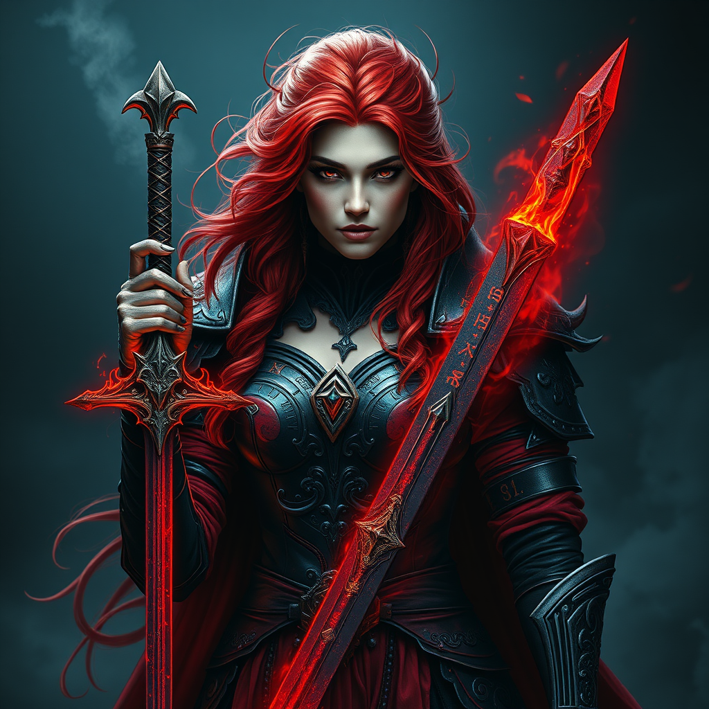A crimson-haired enchantress stands before me, her fiery mane and smoldering eyes cutting through the shadows. She is clad in foreboding black-and-red armor, embellished with sinister scarlet runes that speak of dark sorcery. In her grasp is a sword shrouded in a ruby aura, its glow flowing up her arm like molten lifeblood. Her gaze is locked onto me, and I can feel the gravity of her formidable power as the air itself simmers with an unearthly heat.