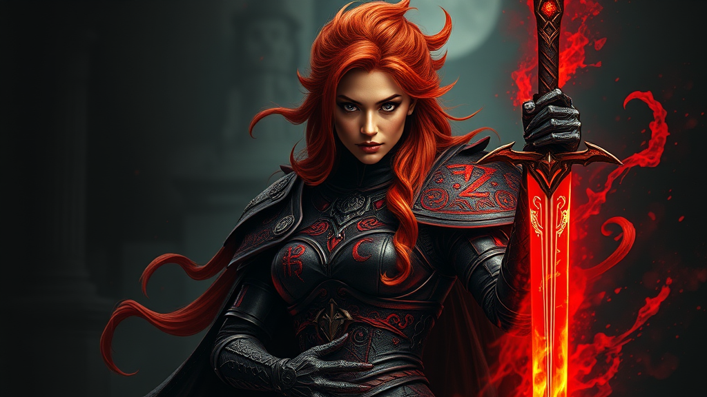 A crimson-haired enchantress stands before me, her fiery mane and blazing gaze cutting sharply through the shadows. She is clad in foreboding black and red armor, adorned with sinister scarlet runes that pulse with blood magic. In her hand, she grasps a sword enveloped in a crimson haze, its glow spiraling up her arm like a vital force. Her eyes lock onto mine, and I can feel the oppressive weight of her dark power, the very air simmering with an unearthly heat.