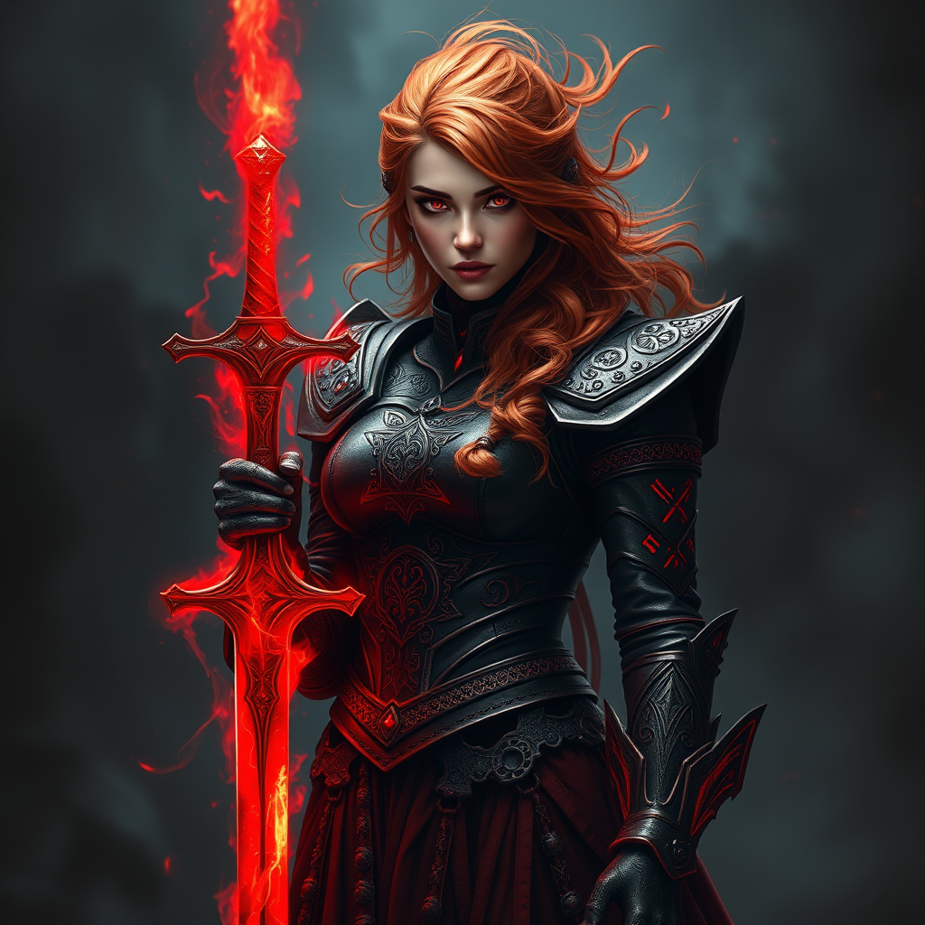 A crimson-haired enchantress stands before me, her fiery tresses and smoldering eyes cutting through the shadows. She is clad in menacing black-red armor, adorned with sinister crimson runes that pulse with the essence of blood magic. In her grasp is a sword enveloped in a scarlet mist, its luminescence flowing up her arm like vital energy. Her gaze firmly locked onto mine, I can feel the oppressive weight of her dark power as the air itself seems to ignite with an unearthly heat.