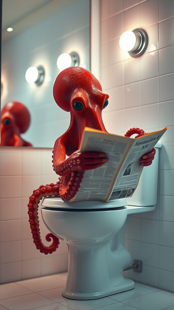 A crimson octopus sitting on a toilet, engrossed in reading a newspaper, surrounded by ambient white lighting. The scene features a background of white walls with a mirror that reflects the intricate details. LED glow lights add a soft, luminous touch, enhancing the hyper-realistic quality. The cinematic lighting highlights each detail, creating an ethereal atmosphere. The emphasis is on bright, clean tones with no trace of darkness, ensuring a highly detailed, photo-realistic setting.