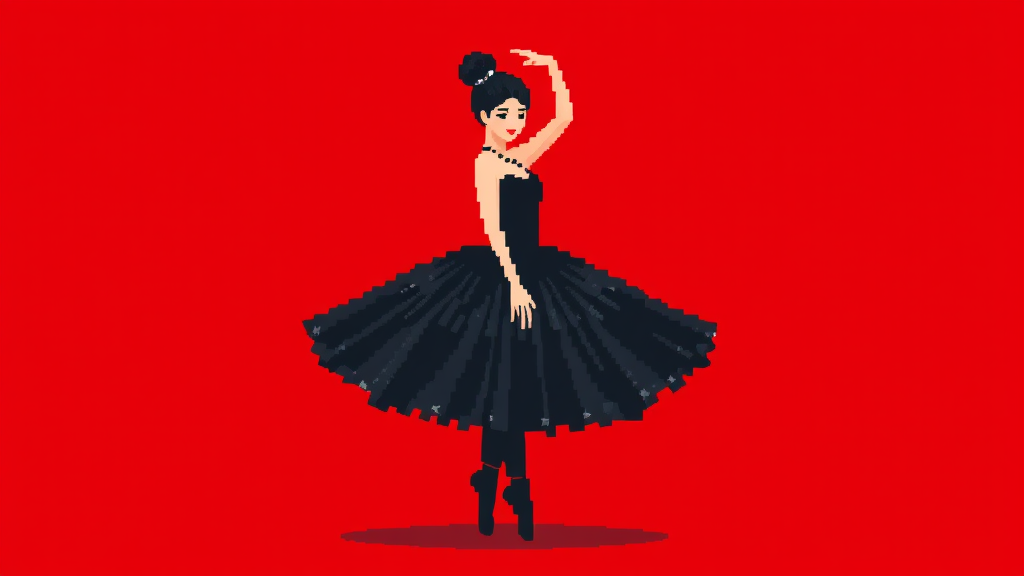 A crimson square backdrop featuring a pixelated ballerina gracefully poised, wearing a midnight black tutu with subtle hints of shimmering silver.