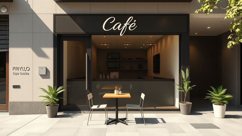A crisp and detailed depiction of a cafe store front, showcasing a sophisticated blend of modernism and minimalism. The facade is sleek with clean lines and large glass windows that allow a glimpse of the minimalist interior. A discreetly placed, elegant sign bears the cafe's name in a contemporary font. Outside, a couple of stylish, simple tables with a few chairs are neatly arranged, capturing a sense of refined simplicity. The color palette is composed of muted tones with occasional vibrant accents in the form of potted greenery, adding a touch of vitality to the scene. The overall image is sharp, highlighting the harmonious balance between modern design elements and an inviting atmosphere.