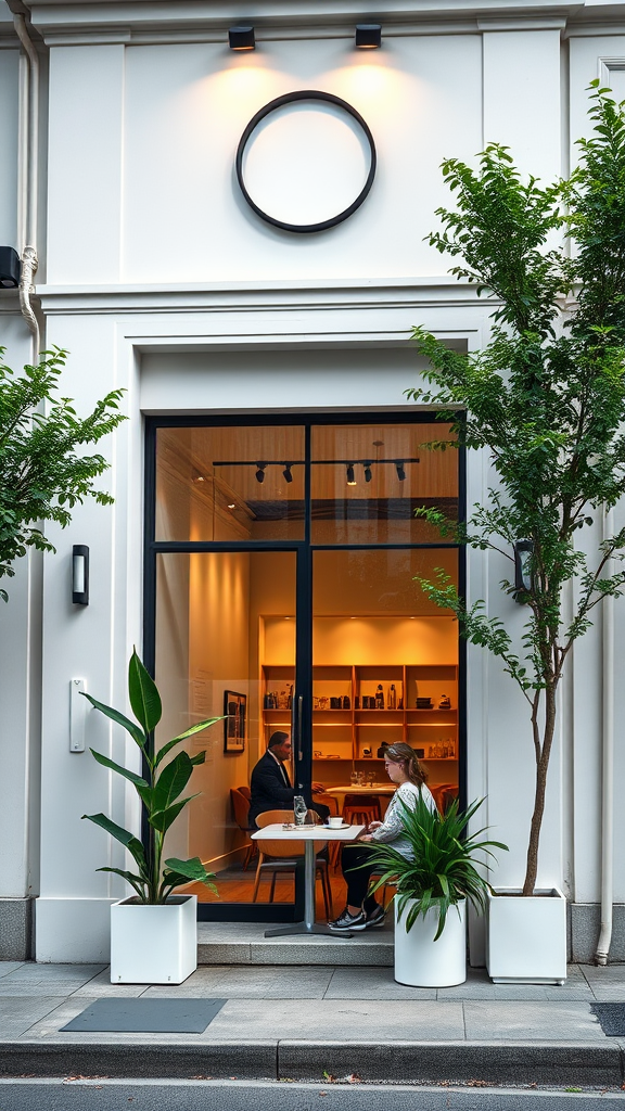 A crisp and detailed image of a cafe storefront exudes both modernism and minimalism, featuring sleek lines and a clean facade. Large floor-to-ceiling glass windows reveal an inviting interior with simple yet elegant Scandinavian-style furniture. The exterior is painted in a soft matte white, with a minimalist black logo elegantly displayed above the entrance. Soft ambient lighting spills onto the sidewalk, creating a warm and welcoming atmosphere. Lush greenery in minimalist planters frames the entryway, adding a touch of nature's elegance to the urban setting. A few patrons sit outside, enjoying their coffee amidst this serene and stylish environment.