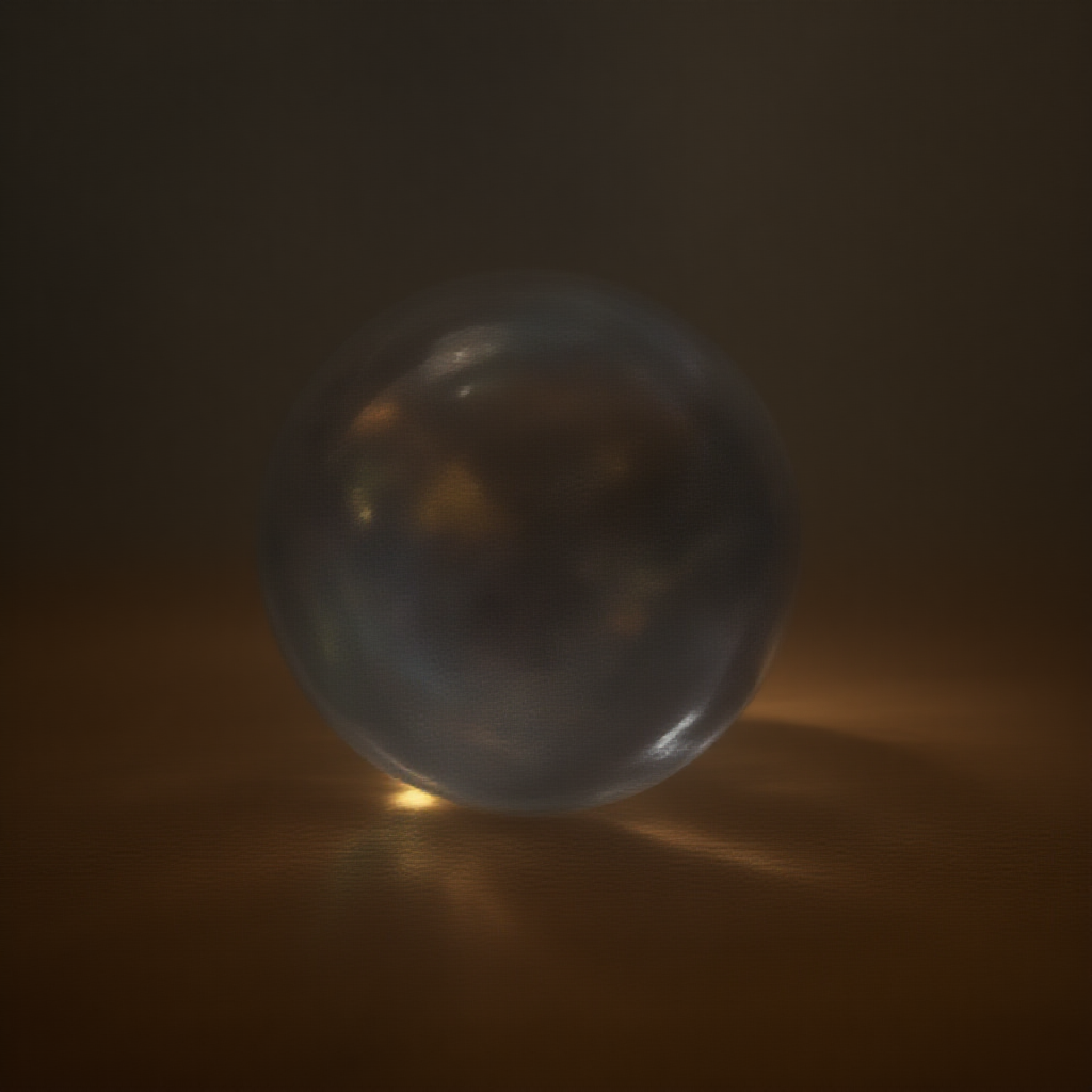 A crystal ball reflecting a myriad of colors sits atop a wooden table, casting soft hues across the room as faint whispers of enigmatic prophecies echo from within.