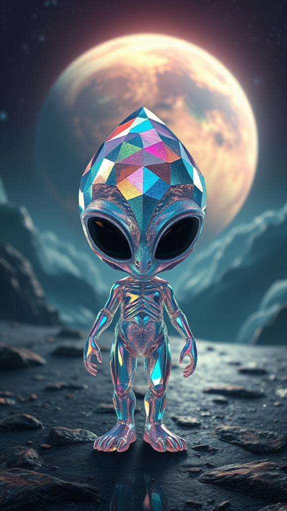 A crystalline alien figure stands prominently, its body shimmering with iridescent hues, casting prismatic reflections in all directions. Two large, lustrous black eyes dominate its face, exuding a depth of emotion and wisdom. In the distant background, a mysterious, swirling planet looms, its surface a tapestry of vibrant colors and swirling clouds. The scene captures a blend of otherworldly beauty and cosmic wonder, as if plucked from a pixelated art piece that bridges the gap between fantasy and reality.