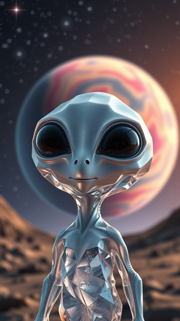 A crystalline alien with a shimmering body stands under the stars, its two large glossy black eyes exuding deep emotion. In the distant background, a vibrant planet with swirling colors adds a sense of wonder and mystery to the scene. The alien's facets reflect the celestial glow, conveying an otherworldly elegance amidst the cosmos.
