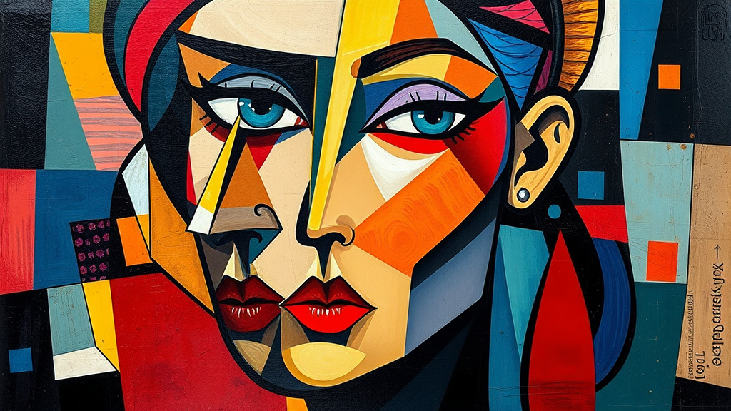 A cubist representation of a woman's visage, reminiscent of Pablo Picasso's style, featuring an intricate blend of sharp geometric shapes and abstract forms. The composition is infused with a symphony of vibrant and contrasting colors, creating a dynamic and vivid interpretation. The artwork captures a harmonious chaos, inviting the viewer into a mesmerizing world where traditional perspectives dissolve, leaving only an alluring mosaic of emotions and expressions.