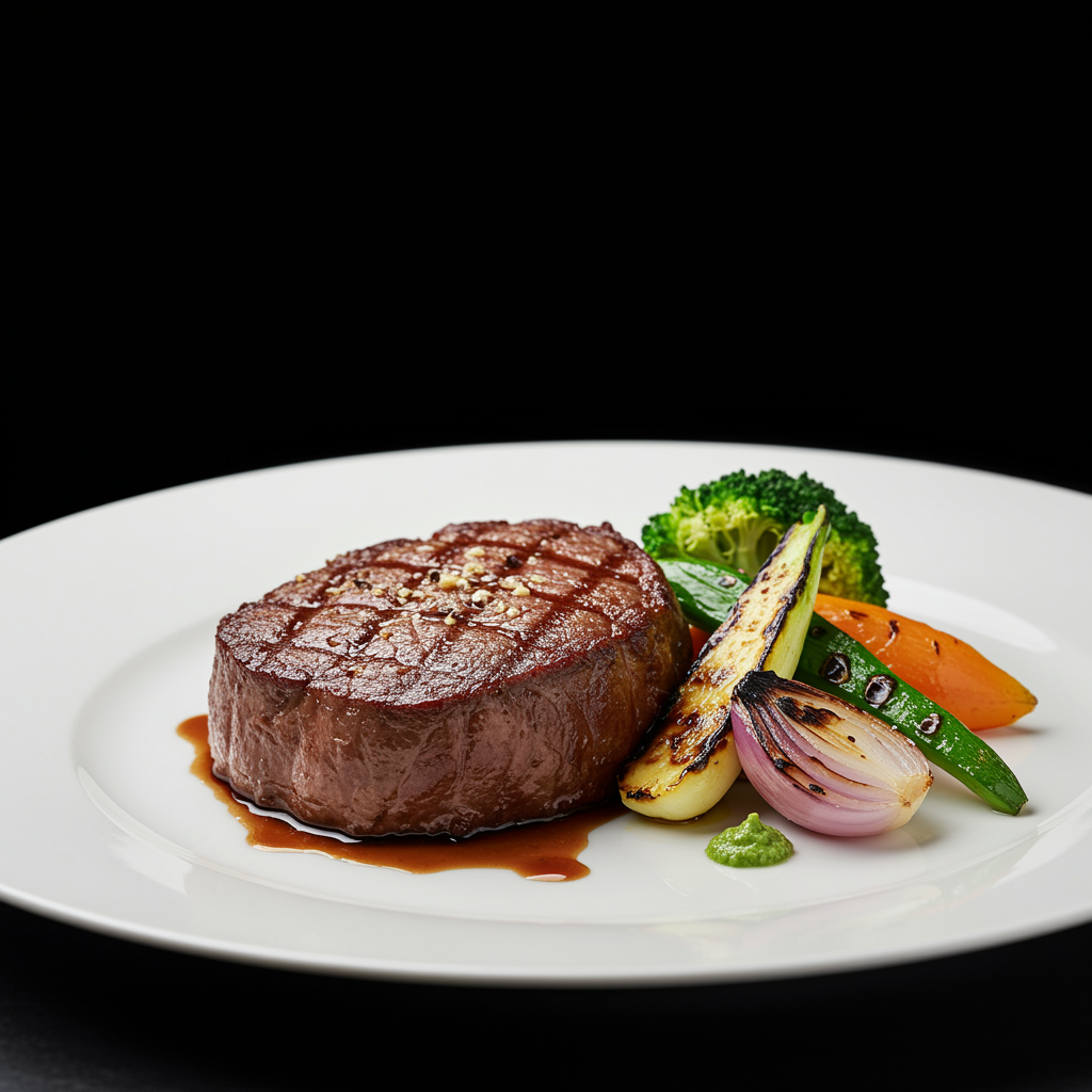 A culinary masterpiece of grilled prime beef accompanied by a medley of perfectly charred seasonal vegetables, captured in an opulent Michelin-star kitchen ambiance. The image boasts refined studio lighting that accentuates the rich textures and colors with an exquisite depth of field, revealing ultra-fine details that highlight the artistry and precision of haute cuisine.