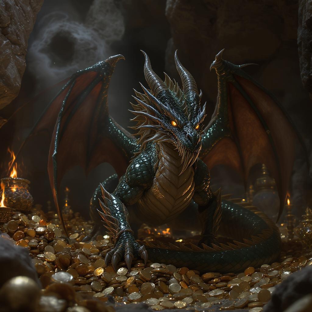 A cunning dragon guardian stands watchful in the treasure chamber, its eyes gleaming with sharp intelligence. Poised among stacks of glittering gold and invaluable artifacts, the dragon remains vigilant, ready to unleash its fiery breath and wield razor-sharp claws against any would-be thieves. It embodies a perfect blend of majestic might and strategic awareness, ensuring the treasures remain untouched beneath its fearsome protection.