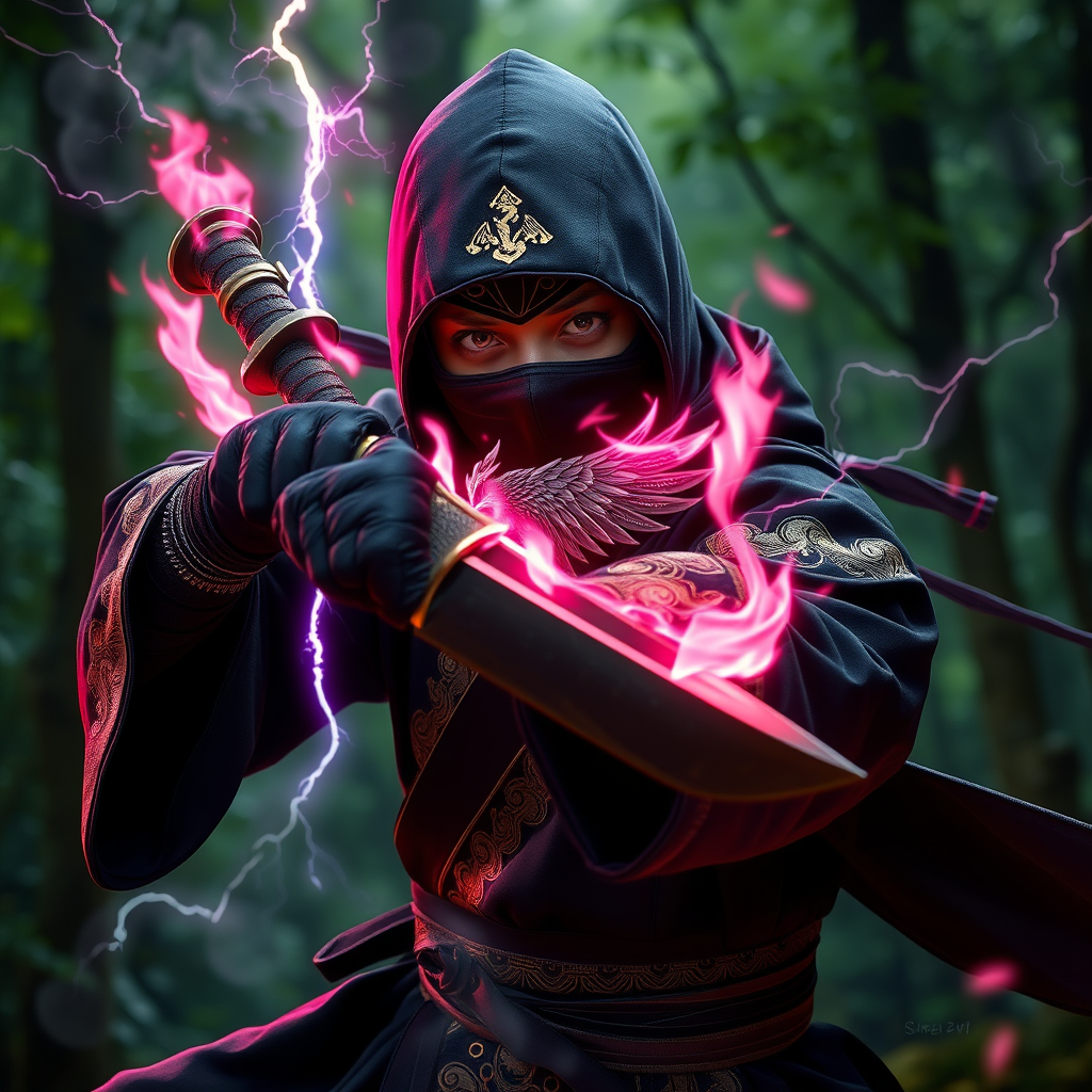 A cunning ninja clad in deep ebony traditional Chinese robes adorned with shimmering gold embellishments assumes a stealthy pose, gripping a kunai etched with an exquisite phoenix motif; their mesmerizing eyes captivate under the soft glow of pink flames flickering along the edges of their hands. As they command the forces of nature with epic flair, air and lightning seem to dance and bend amidst the lush forest setting. The scene pulses with vibrant energy reminiscent of Gustatory-Auditory Synesthesia art, rendered in exquisite detail, capturing the harmony of movement and mystique.