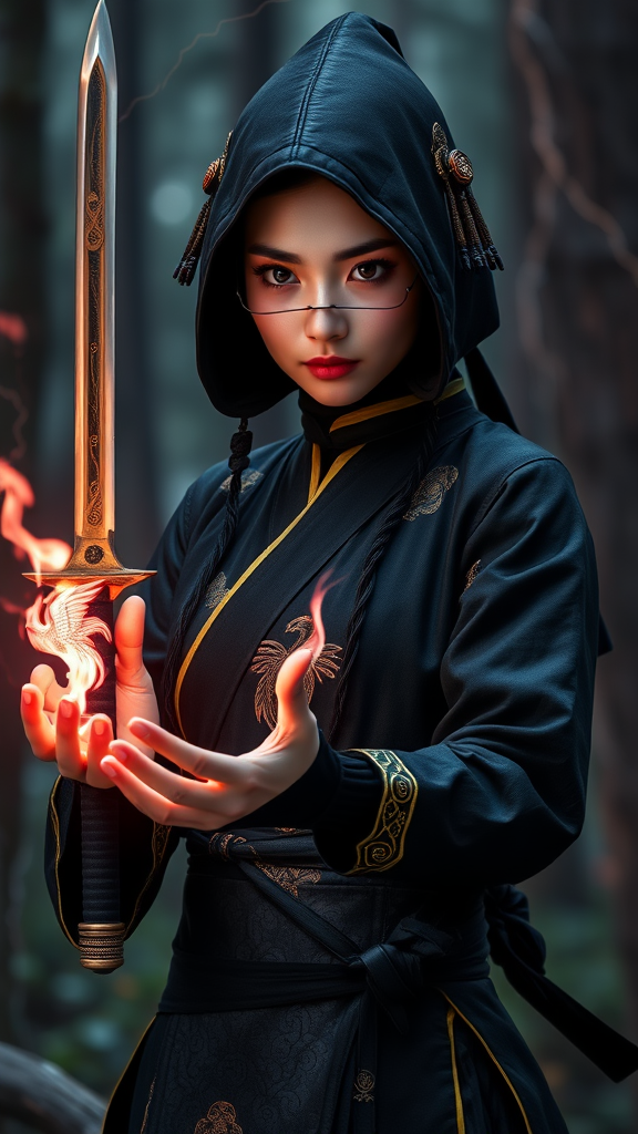 A cunning ninja clad in midnight black traditional Chinese attire, adorned with golden accents, stands stealthily with a phoenix-engraved kunai in hand. Her eyes are mesmerizing, and her palms emit a soft pink flame. The scene captures an epic blend of air, lightning, and forest, creating a symphony of visual and auditory sensations. The image is rendered with super high detail, highlighting the intricate interplay of elements, and evokes a sense of Gustatory-Auditory Synesthesia.