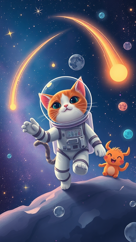 A curious cat astronaut embarks on a whimsical journey through the stars, playfully chasing comets and befriending cosmic creatures amidst the dazzling expanse of the universe.