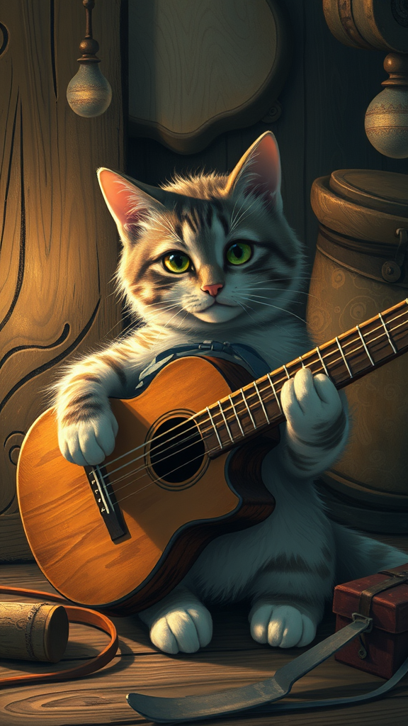 A curious cat discovers an old guitar in the attic, its strings humming softly with a magical melody that seems to play itself, drawing the feline into a whimsical adventure through a world of enchanting music and rhythmic wonders.