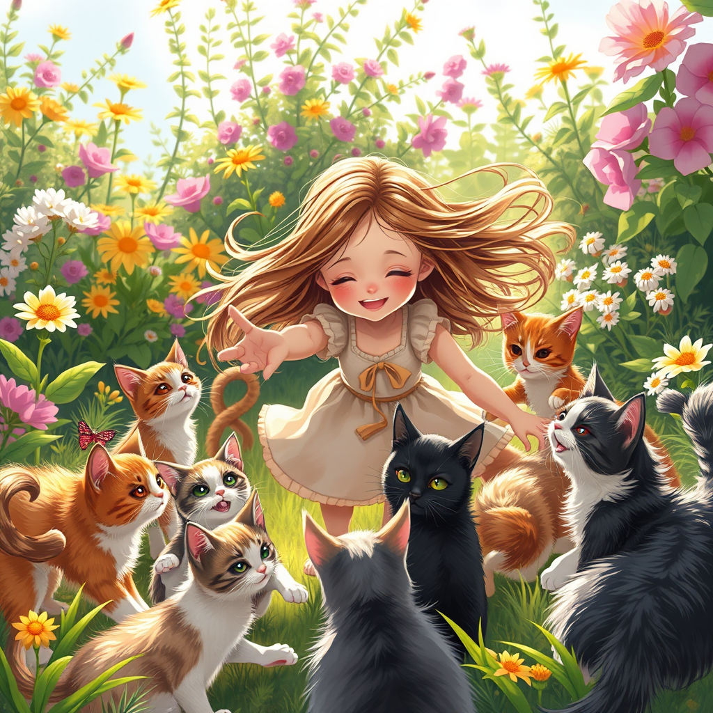 A curious girl with flowing hair playing joyfully amidst a group of playful cats in a sunlit garden, where colorful flowers bloom and gentle breezes sway.