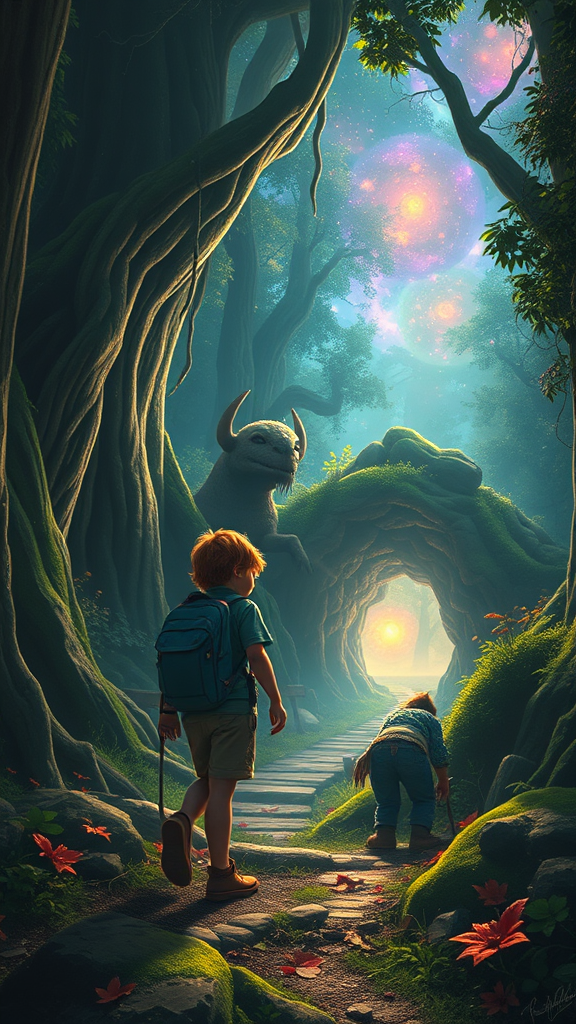 "A curious young explorer stumbles upon a hidden portal in an ancient forest, leading to a vibrant realm where time flows differently and mythical creatures guide the way to unlock hidden truths about the universe."